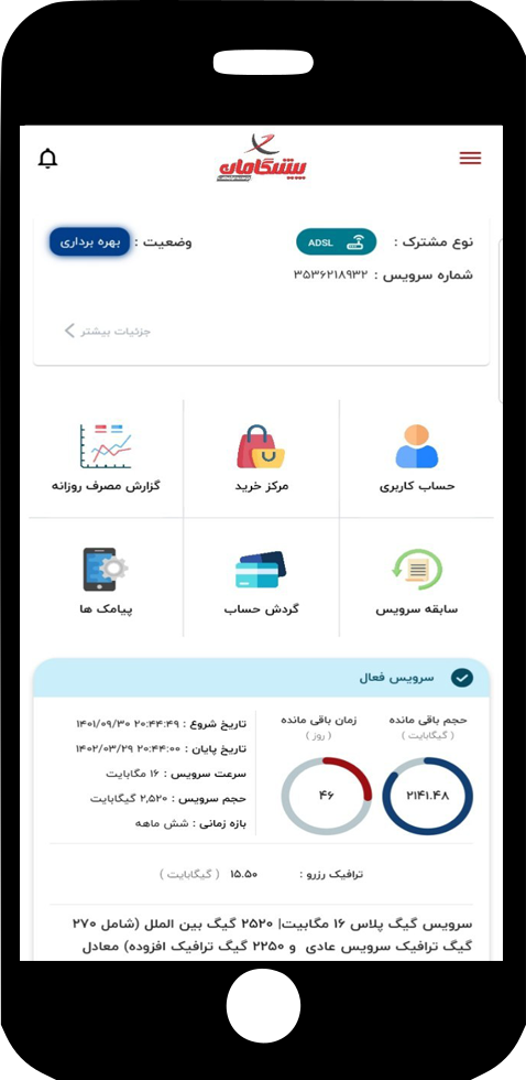 با اپلیکیشن پیشگامان به راحتی میتوانید کلیه سرویسهای اینترنت پیشگامان را روی گوشی موبایل خود مدیریت نمایید و در کمترین زمان سرویس اینترنت خود را تمدید کنید .